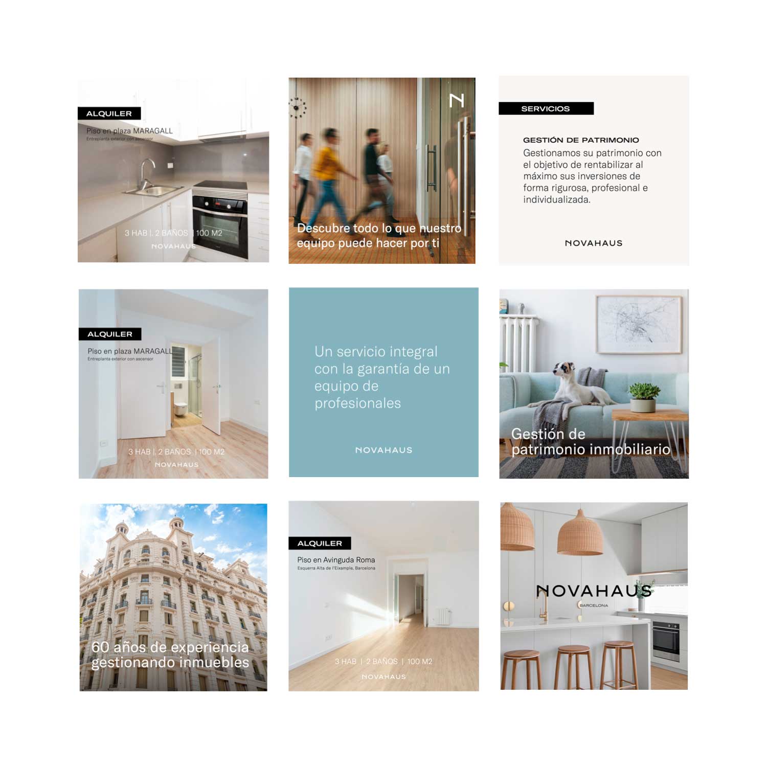 Diseñamos la estrategia y la identidad visual de Novahaus, una marca que ofrece servicios dentro del sector inmobiliario. Creación y puesta a punto de las distintas redes sociales, y diseño de algunas plantillas. Además, diseñamos la página web de la marca.